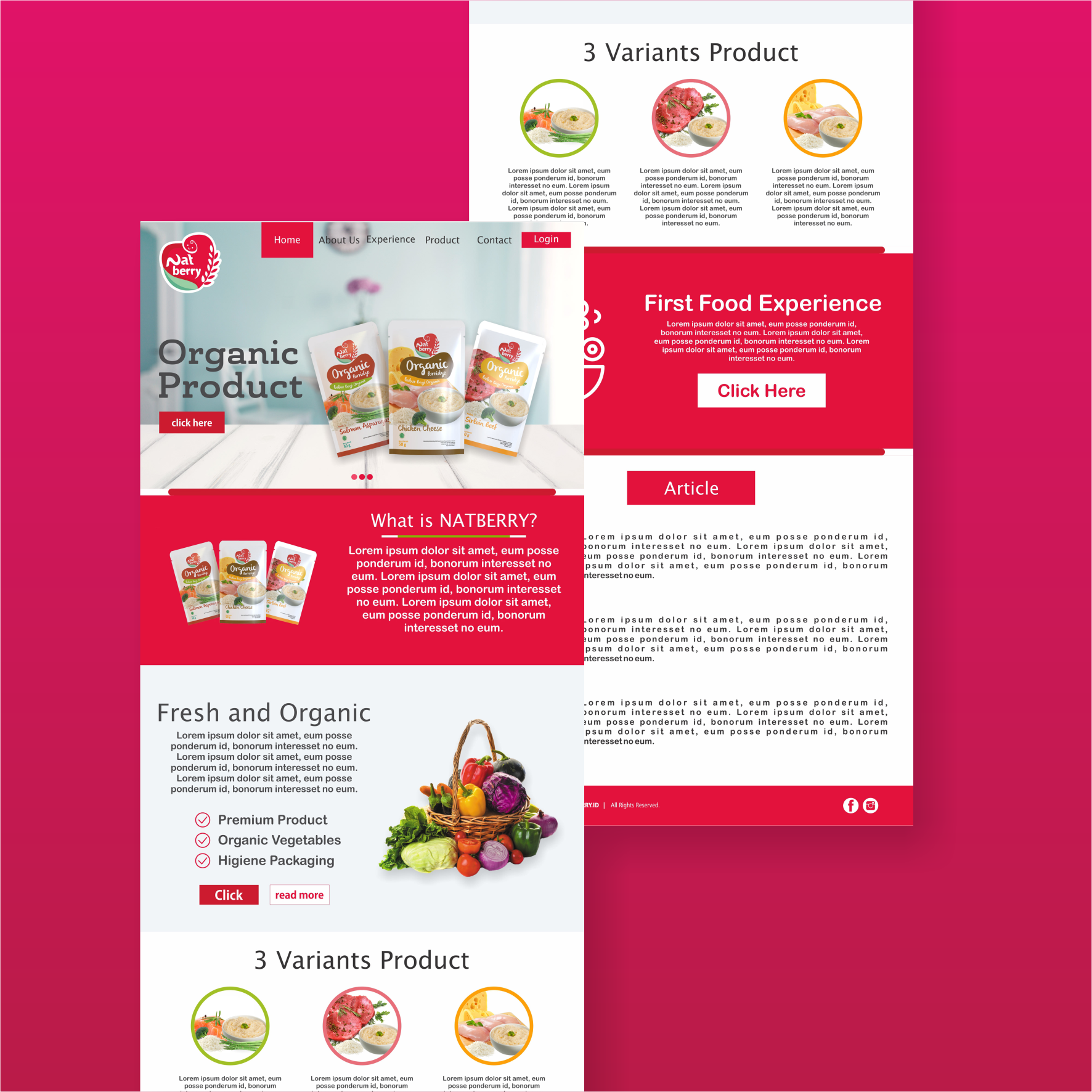 NATBERRY.ID adalah website untuk produk bubur bayi kemasan dengan berbagai varian rasa seperti salmon, beef, dan asparagus. Desainnya mengusung tampilan yang bersih, modern, dan penuh warna, dilengkapi ilustrasi lembut yang ramah anak untuk memperkuat kesan sehat dan terpercaya.